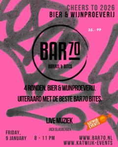 Proost 9 januari 2026 op het nieuwe jaar met iedereen die je liefhebt in deze trendy Bar70 met de lekkerste luxe bites, geselecteerd van mooie wijnen en speciaal bieren! En dat onder het genot van live muziek van niemand minder dan Jack Glasbergen