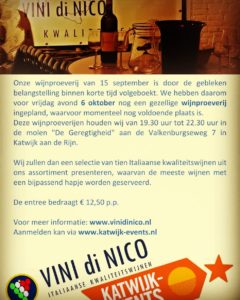 Vrijdag 15 september vanaf 19.30 uur vindt deze wijnproeverij in molen der Geregtigheid plaats. Voor maar 12.50 euro krijg je 10 proefglaasjes en lekkere hapjes.
